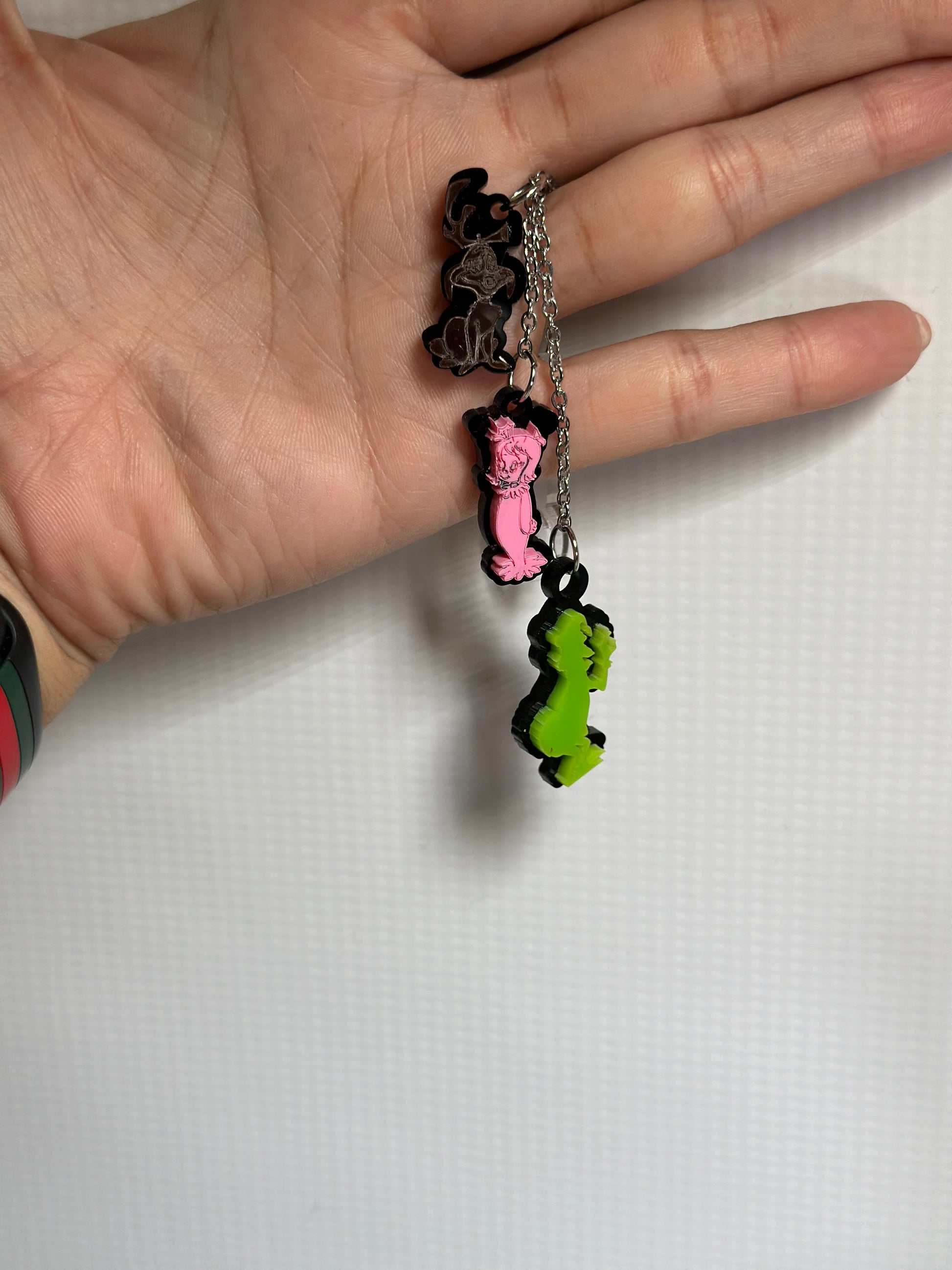 - **Design:** Includes Grinch, pink reindeer, and dog charms.