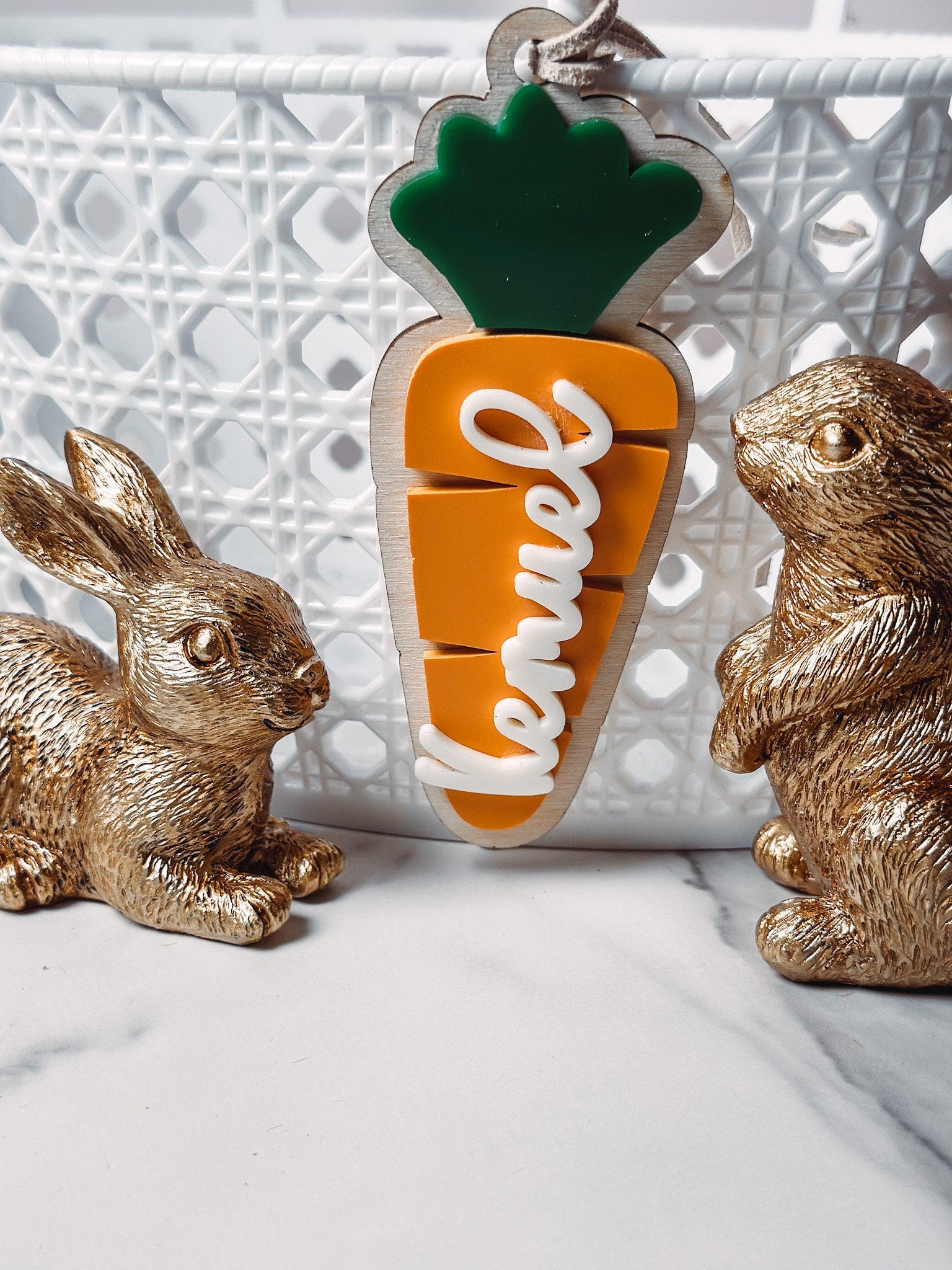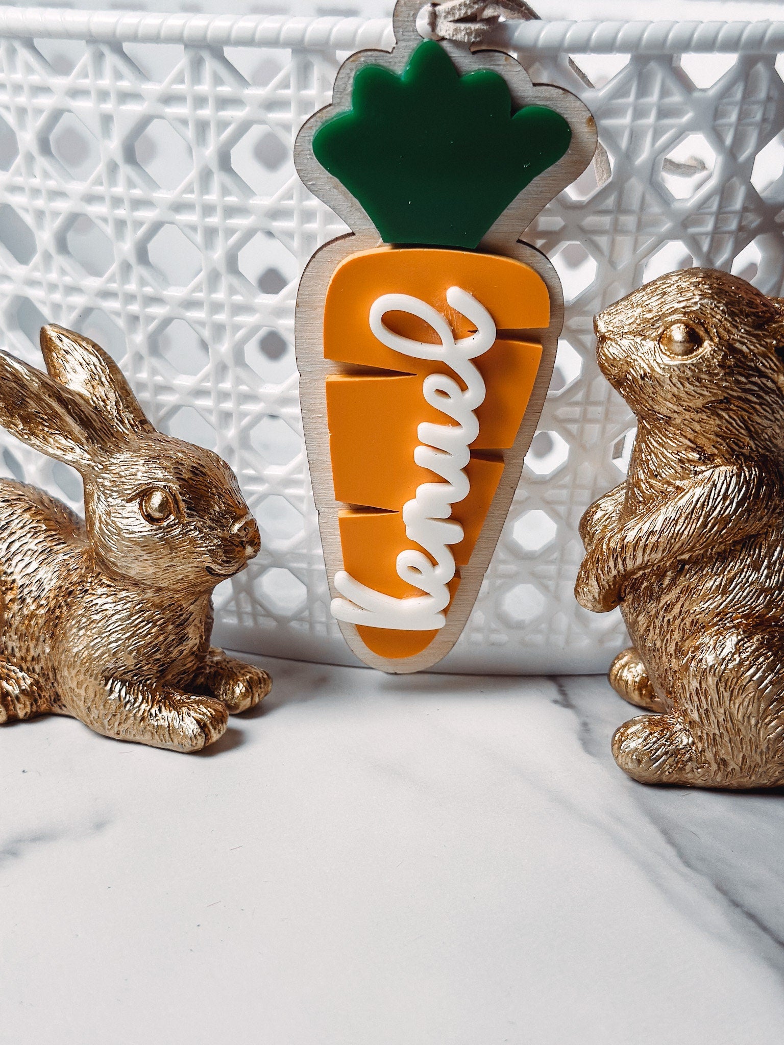Design & Materials: ๐จ Each tag is expertly crafted from three laser-cut layers, combining high-quality birch wood ๐ณ and vibrant colored acrylic. The design features a playful carrot motif ๐ฅ, with each element layered for a striking 3D effect. Plus, the personalized name detail adds a unique and personal touch to each tag.